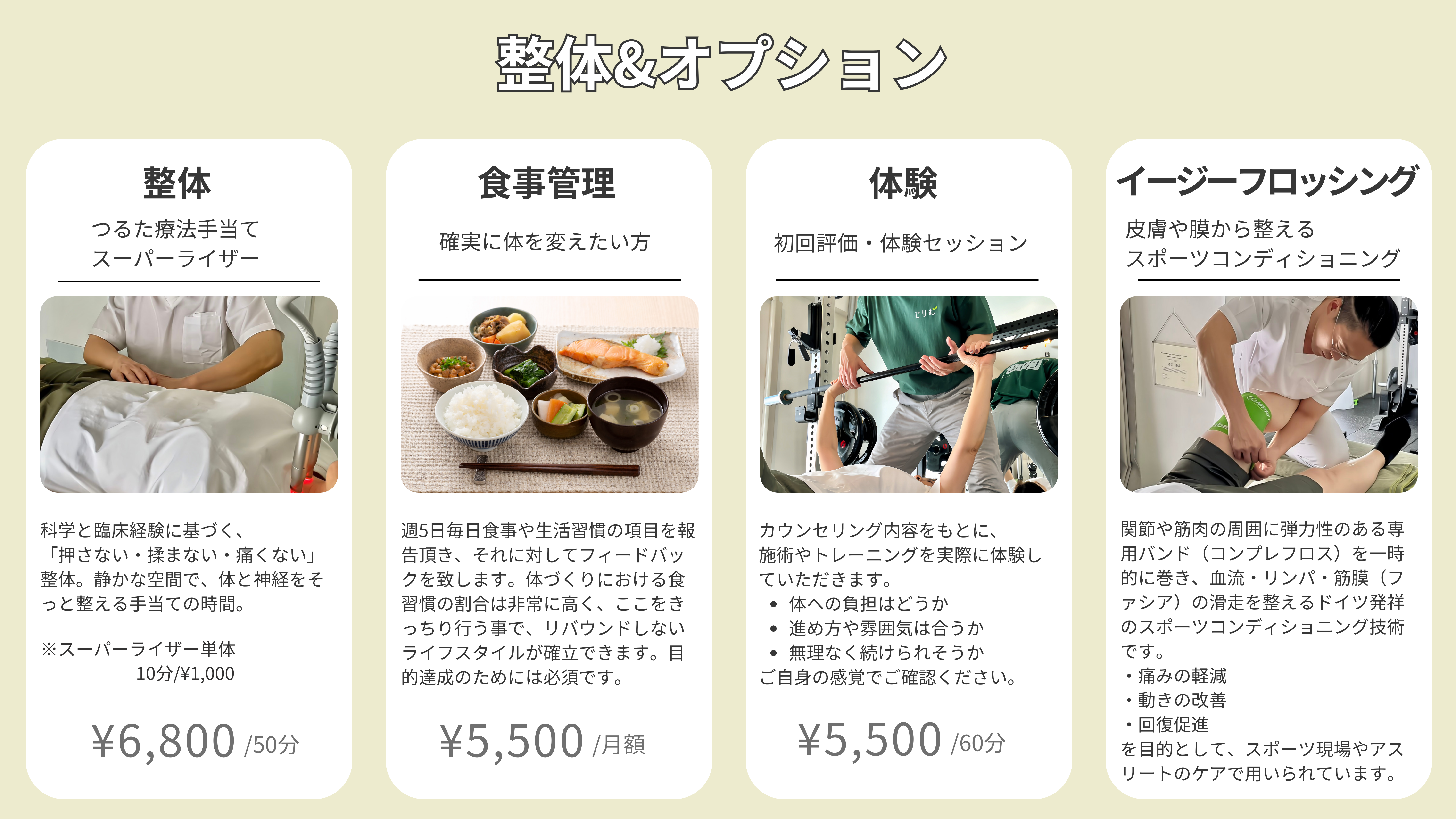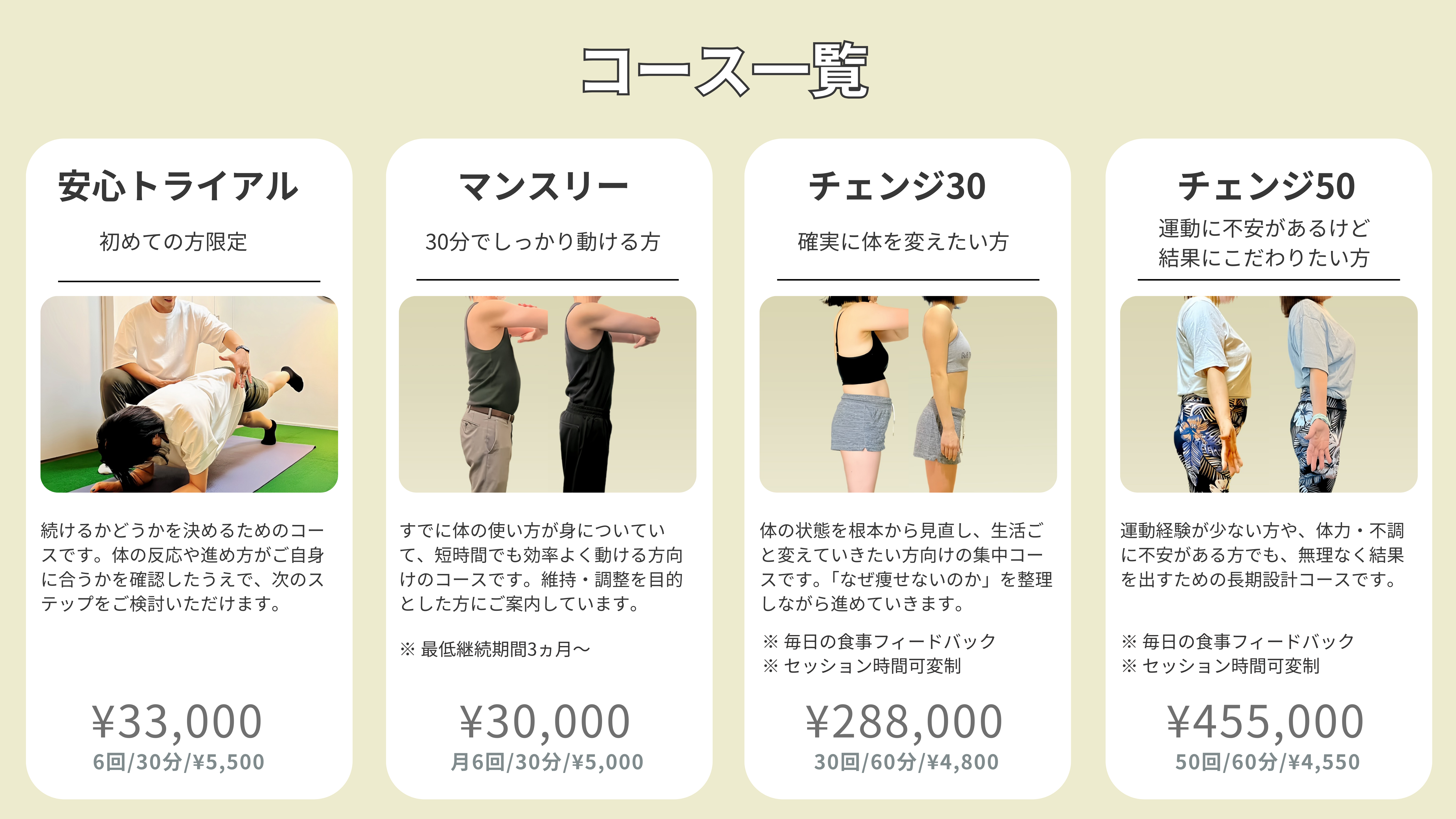 実際の施術やトレーニングをお試しいただけます。 雰囲気やペースがご自身に合うかどうか、無理なく確かめていただけます。